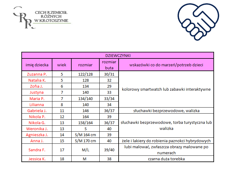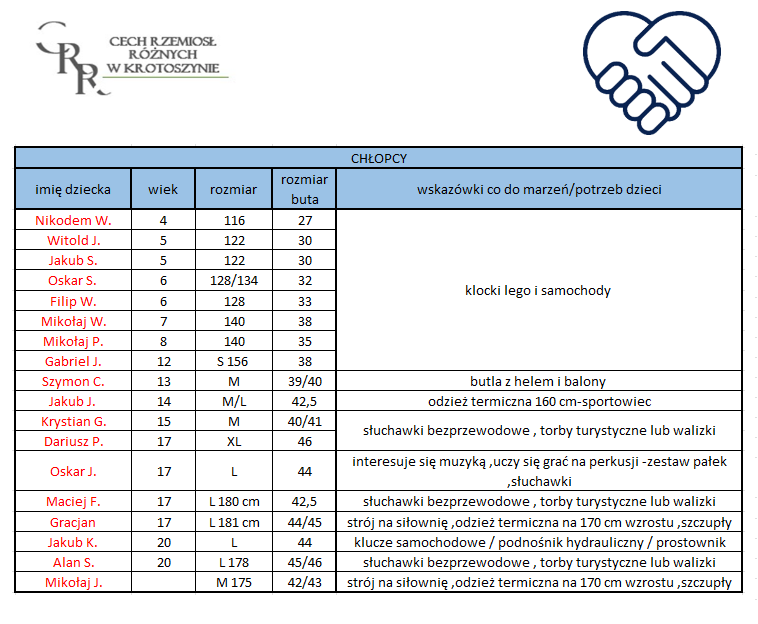 1. paczki na święta dla wybranego dziecka – po wybraniu dziecka z listy, prosimy o informacje do biura Cechu, lista będzie aktualizowana i dziecko, które pozyska Mikołaja, oznaczone będzie na liście kolorem czerwonym. Dla dzieci, które nie pozyskają Mikołaja przygotujemy paczki, aby nikt nie został bez upominku.